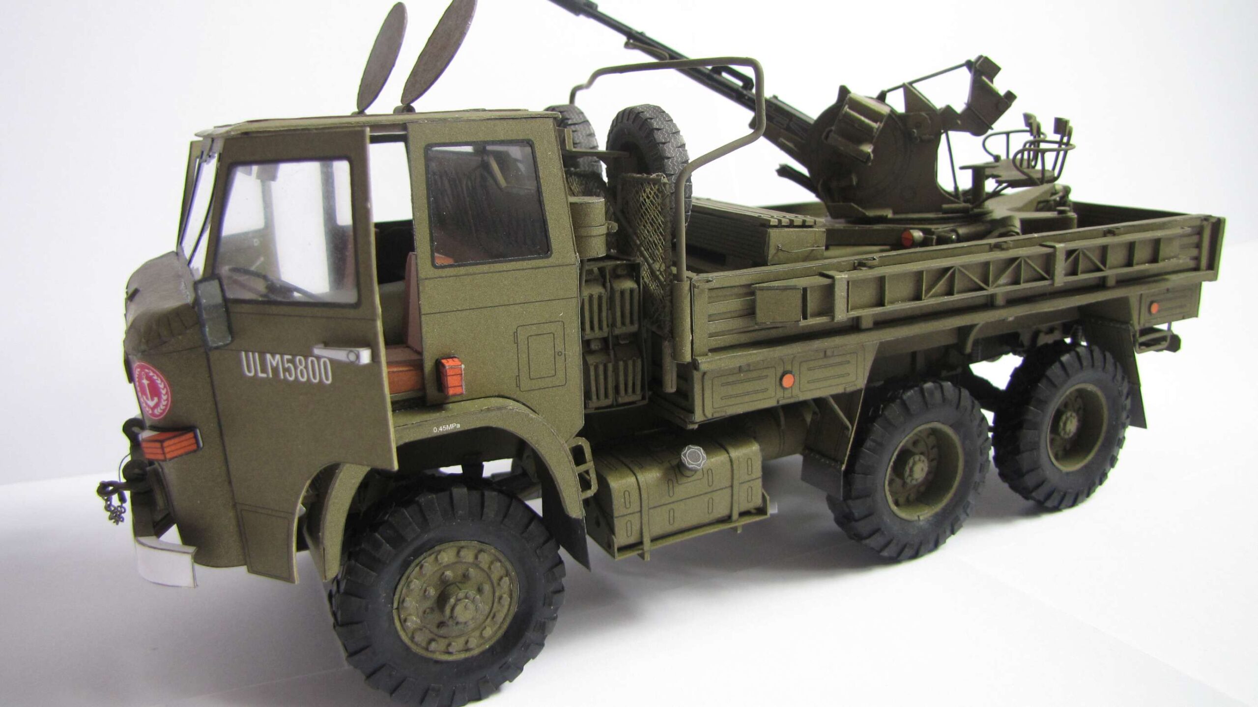 W tym modelu wszystko co mogło się ruszać – rusza się 🙂 . Burty można otwierać/zamykać, można rozwinąć linę z wyciągarki ( niestety zwinąć już trzeba ręcznie), koła się obracają\skręcają, działo p-lot można obracać we wszystkich płaszczyznach. Model bardzo dobrze zaprojektowany, wszystko pasowało. Jeżeli coś zostało niedokładnie zrobione to tylko z mojej winy.